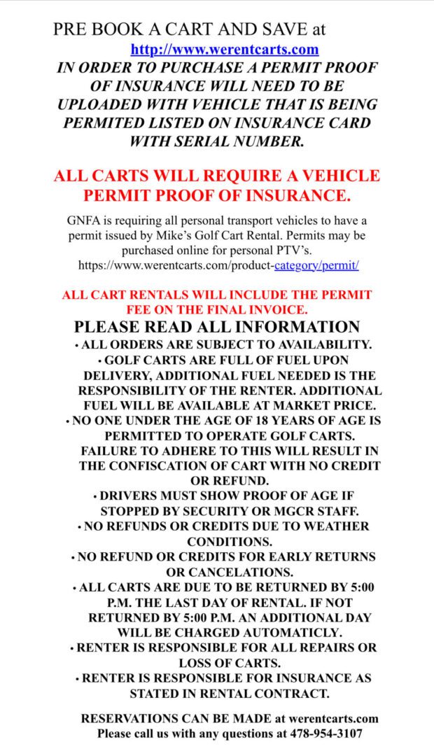 *All carts require a permit as per GNFA Rules. These must be posted on all carts. Permits are available on werentcarts.com